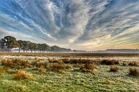 Een winterse zonsopkomst in Exloo, Drenthe, Nederland. Een licht berijpte ondergrond door vorst en mist en blauwe luchten met een vleugje geel door de zonsopkomst. De lijnen lopen prachtig weg in het verlengde van de foto, terwijl de wolkenpartijen dezelfde hoeken kiezen.