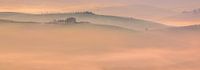 Glooiende heuvels met mist en ochtendlicht, in het hart van Toscane, tussen Pienza en San Quirico in de Val d'Orcia in Midden-Italië.