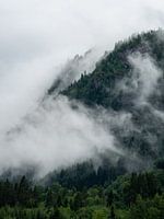Minimalistische foto van de bossen van Noorwegen hangen in de mist van de vroege morgen op een regenachtige dag. De beboste fjorden in de regio van Bergen zijn prachtig voor het maken van wandeltochten, zeker ook bij dit onstuimige Noorse weer.