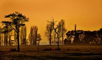 Zonsondergang op een mistige winternamiddag op het Friese platteland nabij Roodkerk