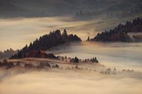 Mist in het Pieniny gebergte bij zonsopgang, Polen