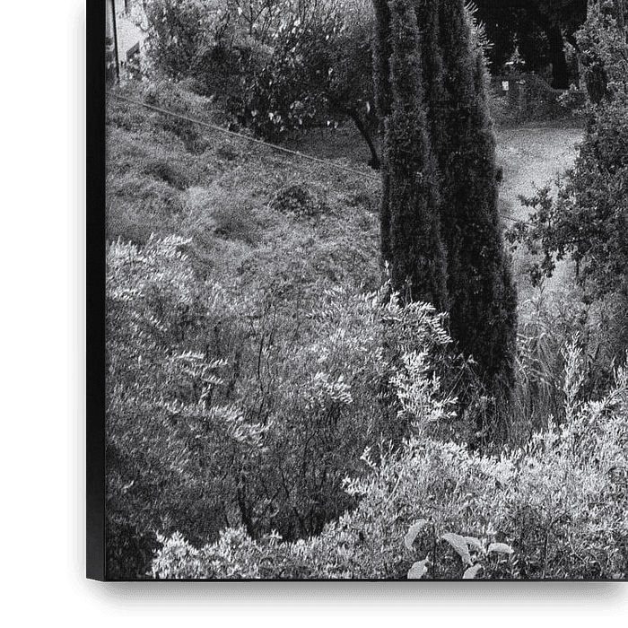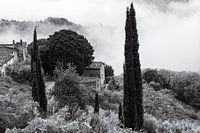 Zwart-witfoto van Matraia , een klein dorpje in de bergen van Toscane in de regio Lucca. Gezicht op een typisch Toscaans huis in de bergen. Op de voorgrond torenen cipressen de hemel in. Mist trekt door het landschap. Zwart-wit landschapsfotografie uit Italië.
