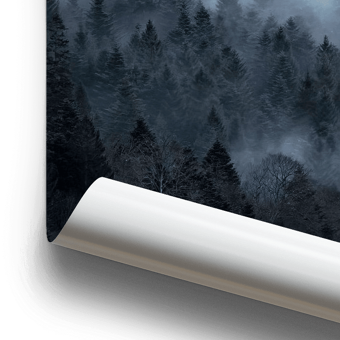 Een dicht en intrigerend portret van een boshelling op een mistige dag. De compositie toont een ononderbroken tapijt van dennenbomen in sombere, blauw-grijze tinten, met de mist die tussen de stammen en kronen door waait. Het beeld is rijk aan detail en textuur, wat de ruigheid van het bos benadrukt. Een sfeervol, donkerder werk dat…