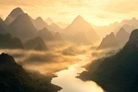 Een zachte mist omhult de majestueuze bergen terwijl de zon langzaam haar gouden stralen verspreidt. De rivier meandert elegant door het landschap en de harmonie van water en licht roept een dromerige sfeer op. Rust en grandeur vormen hier een adembenemend natuurelement.