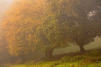 De kleurrijke bladeren aan de bomen gloeien in de herfst, zelfs in de mist. Stilte verspreidt zich over de hellingen van de bergen. Op deze foto voelt de kijker de rust en geniet hij van de stilte.