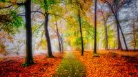 Een beeld van nevel - mist in het bos tijdens de herfst. Het herfst seizoen met mooie herfstkleuren vanuit het boslandschap. Een fietspad midden in de foto.
