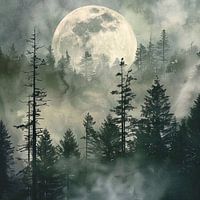 Deze fascinerende foto toont een dicht bos gehuld in mysterieuze mist. Op de achtergrond staat een majestueuze volle maan, waarvan het koele licht het landschap in een mystieke gloed hult. De hoge, donkere bomen lijken de bewakers van een vergeten wereld waar de kijker alleen maar naar kan raden. De combinatie van mist, maanlicht en dichte vegetatie creëert een sfeer van rust en mysterie, die doet denken aan de ongerepte schoonheid en mysterieuze kracht van de natuur.