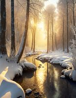 Een beekje stroomt door een besneeuwd en mistig winterbos met een zonsopgang op de achtergrond.