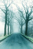 Een laan met hoge eiken op een mistige ochtend in het noorden van Nedersaksen in Duitsland.