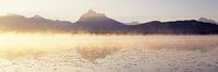Mist over de Hopfensee bij zonsopgang, Allgäu, Beieren