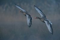 In het laatste licht van de dag komen twee grauwe ganzen aanvliegen om te rusten op een door riet omgeven watervlakte. Beide vogels vliegen synchroon naast elkaar met hun vleugels wijd gespreid. De lichte kromming van de ganzen geeft zicht op de prachtige verentekening op hun bovenvleugels. De sterke, driehoekige roze snavels van de twee ganzen, die typisch zijn voor grauwe ganzen, zorgen voor kleine kleurspatten. Een duidelijk gedetailleerd beeld in aangenaam rustige, zachte, warme, gedempte kleuren. Bovendien een prachtig motief uit de inheemse vogelwereld.