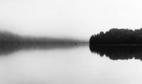 Op een vroege morgen hing de mist nog net boven het meer van Bohinj. Het was prachtig mysterieuze sfeer. Ook vaarde er een bootje over het midden langs de bomen. In zwart-wit wordt de symmetrie nog eens extra benadrukt.