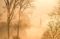 De Dender in Idegem op een ijzige morgen met opkomende mist in zwart wit met een uitzicht van het plaatselijke kerk.