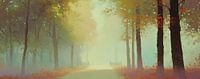Mist - Je stapt als het ware een laan in waar twee dingen je meteen grijpen: de stevige donkere stammen van de bomen langs het pad en de dikke, zachte sluier van licht en mist die alles verderop weghaalt. Het is een mist schilderij waarin de horizon niet scherp is maar suggereert: er is iets aan het einde van het pad — twee bankjes…
