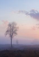 Boom in de mist in het Leersumse veld tijdens zonsondergang