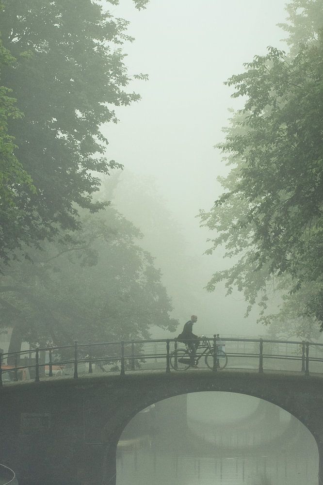 Prachtige foto van een eenzame fietser die fiets door de ochtendmist in Amsterdam fiets. Van de kalme rustieke uitstraling wordt je heerlijk rustig.