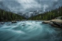 Kolkende rivier in de Mistaya Canyon in Banff National Park Alberta Canada. De foto is genomen met een vrij lange sluitertijd voor een schilderachtig, mystiek effect.