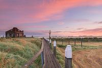 Schokland (Flevoland, Neerland) was vroeger een eiland. Enkele restanten zijn daar nog van overgebleven. Hier de toenmalige haven van Schokland. Het gebouw was de misthoorn, zodat de schippers de haven in de mist terug konden vinden. Tijdens zonsopkomst kleurde de lucht schitterend. In de verte is nog grondnevel te zien. Een locatie ten…