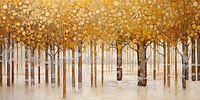 Een kleurrijk digitaal schilderij een gouden bos. De bomen steken uit boven een laag dikke mist. Dit werk is geïnspireerd door de vormen en het kleurenpallet van "De Kus". Het werk geeft een warme en klassieke uitstraling van uw interieur!