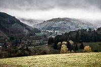 Deze prachtige wanddecoratie van het mistige Gräfentahl in Thüringen, Duitsland, legt de betoverende sfeer van een kalm heuvellandschap vast. De nevel die zachtjes over de heuveltoppen hangt, creëert een gevoel van mysterie en rust, waardoor dit kunstwerk ideaal is voor wie houdt van serene, natuurlijke schoonheid. Omgeven door groene velden en dichte bossen, straalt dit beeld een tijdloze elegantie uit en voegt het diepte toe aan elke ruimte.
