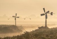 Mistig Hollands landschap met vogels en windmolentjes