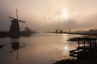 Op een zonnige vroege morgen naar Kinderdijk met de camera. Toen de zon iets hoger kwam werd het ineens mistig. Er ontstond een bijzonder sfeertje en we maakten nog snel wat foto's voordat het helemaal dicht trok en we alleen de voorste molen nog vaag konden zien.