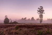 Frisse herfstkleuren tijdens zonsopkomst met enkele berk in heide veld met contrast van intens blauwe atmosfeer in de achtergrond en vegetatie te zien door de ochtenddauw in magenta en oranje kleuren van opkomende zon.