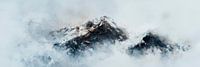 De ruige toppen torenen majestueus uit boven de dichte mist, alsof ze mysterieuze verhalen fluisteren. Het spel van licht en schaduw benadrukt de ongetemde schoonheid van de natuur, terwijl zachte wit- en grijstinten een dromerige sfeer creëren. Hier versmelt werkelijkheid met fantasie en nodigt je uit om onbekende hoogten te verkennen.