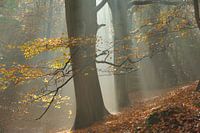 Mistig bos met zonnestralen tussen dikke oude beuken in het najaar. De herfstbladeren zijn geel en oranje van kleur. Foto is gemaakt op Landgoed Elswout bij Haarlem.