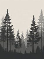 Een stemmige, sfeervolle scène met groenblijvende bomen die oprijzen uit lagen ochtendmist in grijstinten. De meervoudige dieptelagen creëren een mysterieuze, vredige bosachtige sfeer die perfect is voor natuurliefhebbers, hutdecoraties of mensen die houden van Scandinavische bosesthetiek.