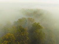 Bos bedekt met een deken van mist van bovenaf gezien tijdens een herfstochtend bij de rivier de IJssel in Overijssel. De boomtoppen steken boven de dichte mist uit en sommige bomen beginnen van kleur te veranderen tijdens het jaarlijkse herfstseizoen. De mist geeft het landschap een mystieke sfeer.