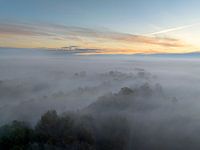 Bos bedekt met een deken van mist van bovenaf gezien tijdens een herfstochtend bij de rivier de IJssel in Overijssel. De boomtoppen steken boven de dichte mist uit en sommige bomen beginnen van kleur te veranderen tijdens het jaarlijkse herfstseizoen. De mist geeft het landschap een mystieke sfeer.