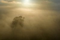 Bos bedekt met een deken van mist van bovenaf gezien tijdens een herfstochtend bij de rivier de IJssel in Overijssel. De boomtoppen steken boven de dichte mist uit en sommige bomen beginnen van kleur te veranderen tijdens het jaarlijkse herfstseizoen. De mist geeft het landschap een mystieke sfeer.