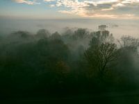 Bos bedekt met een deken van mist van bovenaf gezien tijdens een herfstochtend bij de rivier de IJssel in Overijssel. De boomtoppen steken boven de dichte mist uit en sommige bomen beginnen van kleur te veranderen tijdens het jaarlijkse herfstseizoen. De mist geeft het landschap een mystieke sfeer.