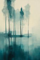 In zachte blauwe tinten glijden melancholische boomsilhouetten over een spiegel van stilstaand water, terwijl de mist mysterieuze dieptes creëert. Deze harmonieuze compositie straalt rust en elegantie uit en verandert elke kamer in een oase van ontspanning. Ideaal als accent in de slaapkamer of woonkamer, het werk nodigt uit om te dromen.