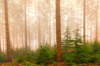 Mistig dennenbomen landschap tijdens een mooie herfstdag op de Veluwe in Gelderland.