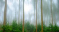 Mistig dennenbos tijdens een koude winterdag in December op de Veluwe in Gelderland, Nederland. Motion Defocussed-effect in het bovenste gedeelte van de foto.