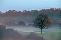 Zicht op een Luxemburgs golfterrein in de mist tijdens de herfst.