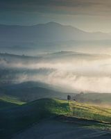Mistig landschap in Volterra bij zonsondergang. Eenzame boom, glooiende heuvels lagen op de achtergrond. Val di Cecina, Toscane, Italië, Europa