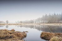 Foto van een Nederlands landschap in de mist. De bomen reflecteren mooi in het stille water.