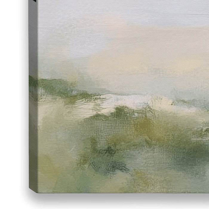 Een zachte overgang van zachte pastelkleuren vult de kamer en nodigt uit tot dagdromen. De zachte, vage lijnen van het landschap smelten harmonieus samen met de lucht, terwijl fijne nevelsluiers het landschap omhullen. De kalme stilte van dit landschap ademt een meditatieve sfeer uit die de kijker uitnodigt om te blijven hangen.