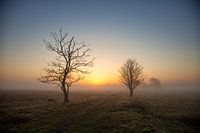 Na een koude nacht beloofd het een zonnige dag te worden. De zon komt op terwijl er nog een nevelige mist boven het Kloosterveld hangt.