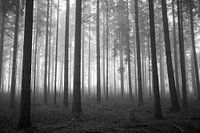 Zwart wit uitvoering van een naaldbos op de Veluwe tijdens de mist. Het licht achter dit bos komt van een open veengebied.