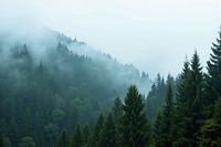 Mistig berglandschap met een dicht naaldbos op een heuvel, met enkele hoge groenblijvende bomen op de voorgrond. Het kleurenpalet is overwegend gedempt groen en blauw, met een wazig, sfeervol perspectief.