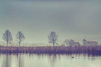 Koop de foto Mistig rustiek landschap met een zwemmende eend op de vijver | Bourgoyen Gent van Daan Duvillier | Regio in de Kijker op canvas, aluminium dibond, (ingelijste) fotoprint, behang en ArtFrame, op maat geprint in Fine-Art kwaliteit.