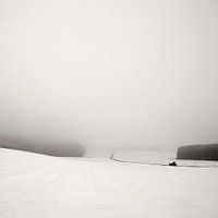 Minimalistische foto van een winterlandschap in Beieren, met sneeuw, velden, mist en een weg.
