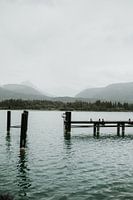 Uitzicht over de bergen vanaf het meer tussen de mist van regenbuien nabij Salzburg in Oostenrijk.