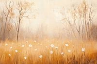 Zachte mist omhult een rustig veld waarop tere bloemen bloeien in zacht wit. De delicate bomen passen harmonieus in het warme, aardse kleurenpalet. Dit kunstwerk creëert een vredige sfeer en is perfect voor de slaapkamer om een vleugje natuur en rust toe te voegen.