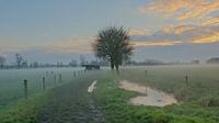 Modderig pad doorheen mistige weides met knotwilgen in de Oude Kalevallei, Vinderhoute, Belgie