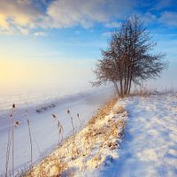 Een mistig winterlandschap met een enkele boom en een fraaie lucht tijdens het laatste uur van een koude mistige winterdag in vierkant formaat.